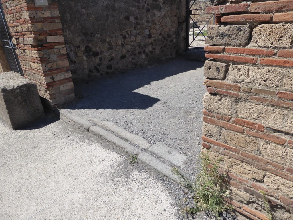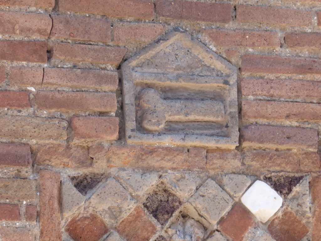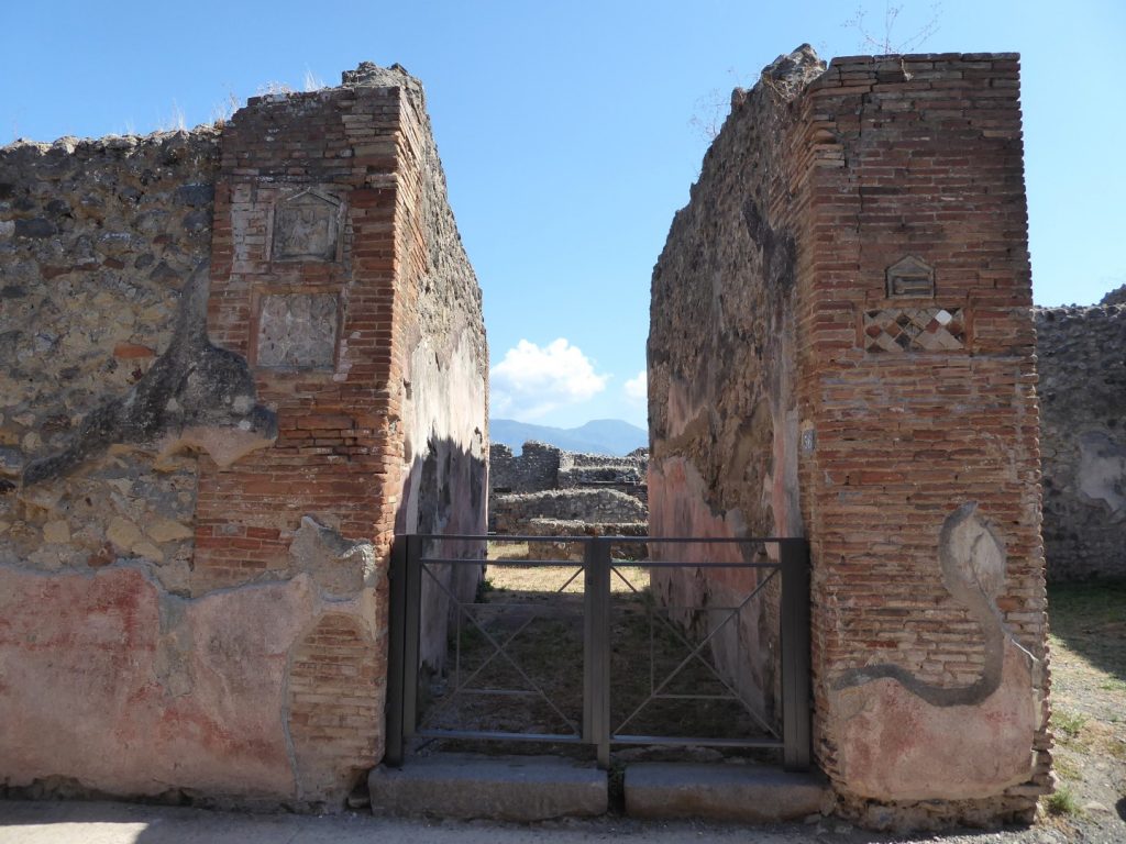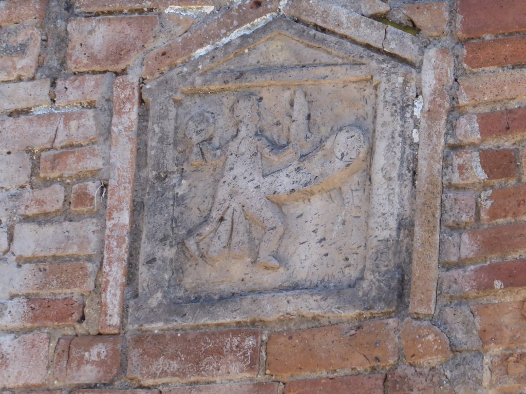 High up on the walls on either side of this entrance there are street signs. The one on the left shows the God usually known by the Greek name of Priapus, but I think the Roman name more interesting – Mutunus Tutunus. On the right there is an appropriate pointer to a brothel.