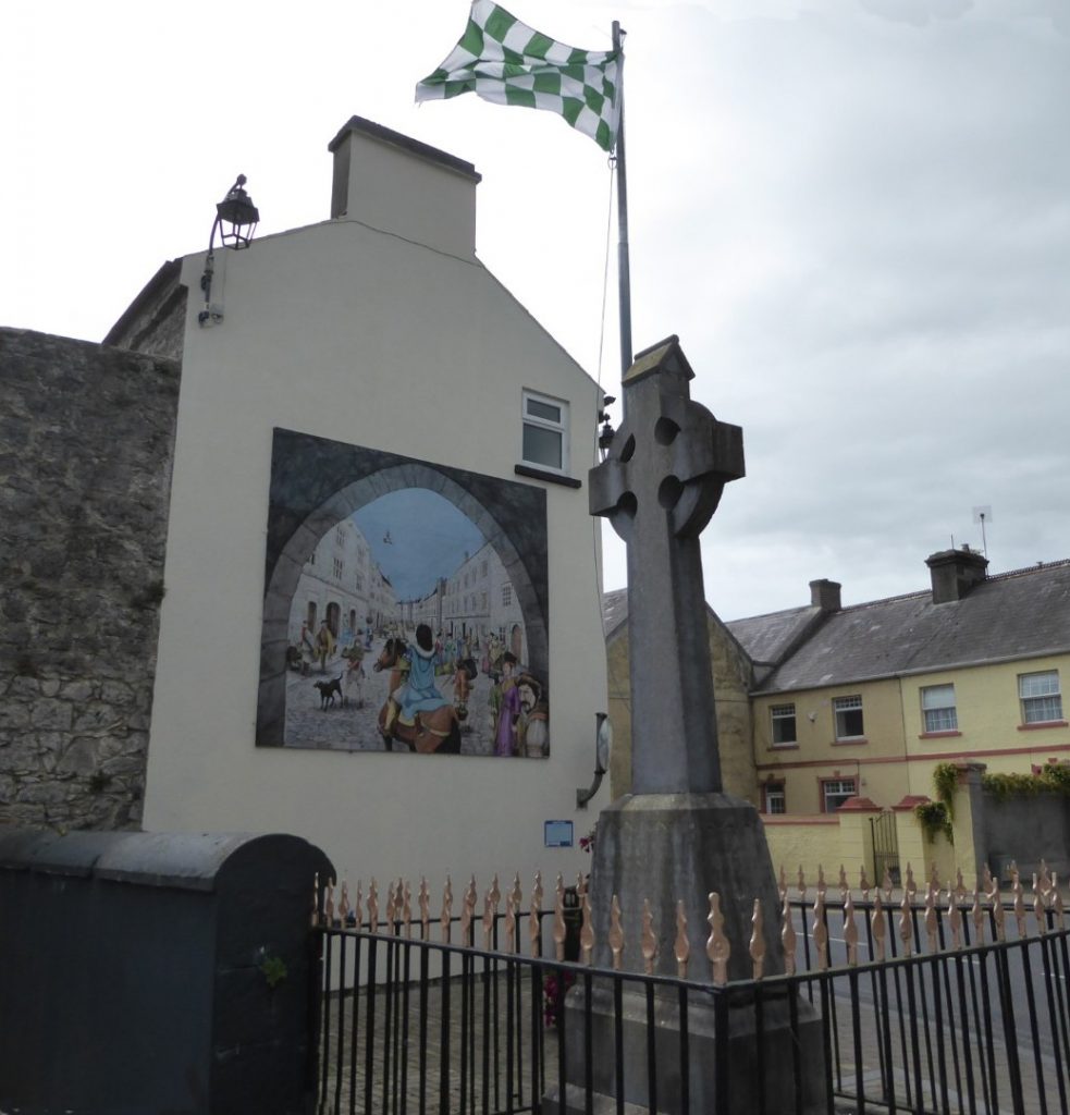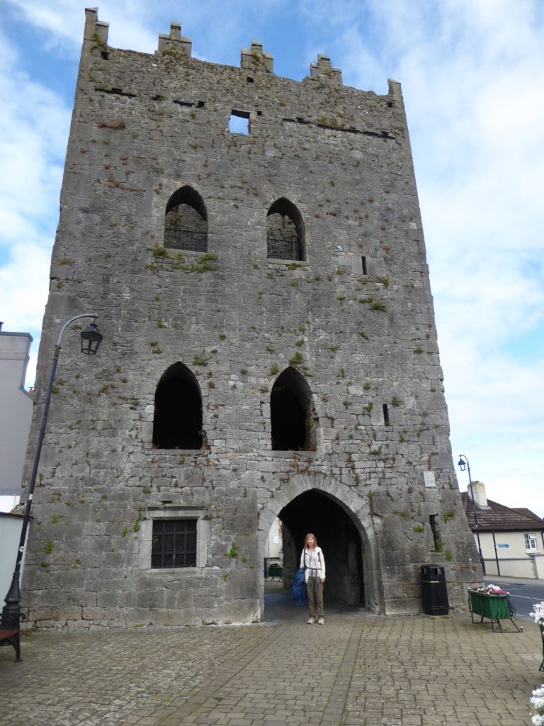 The plaque by King John’s Castle reads “Although named after King John who died in 1216, this four-storeyed tower was not built until the 15th or 16th century. It is an example of a tower-house or late medieval fortified residence. There were most probably several of these towers in Kilmallock originally but only this one survives. It is likely that it was the property of a wealthy merchant of the town. It straddles one of the original medieval streets and access to the centre of the town was made through the archway. The windows with mullions are original, but the pointed windows which are such a striking feature were inserted into it in the late 18th century. In 1645 the Catholic Irish forces under Lord Castlehaven used the tower as an arsenal and less than a decade later Cromwell’s parliamentary forces used it as a hospital and depot.”