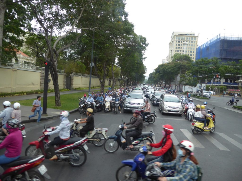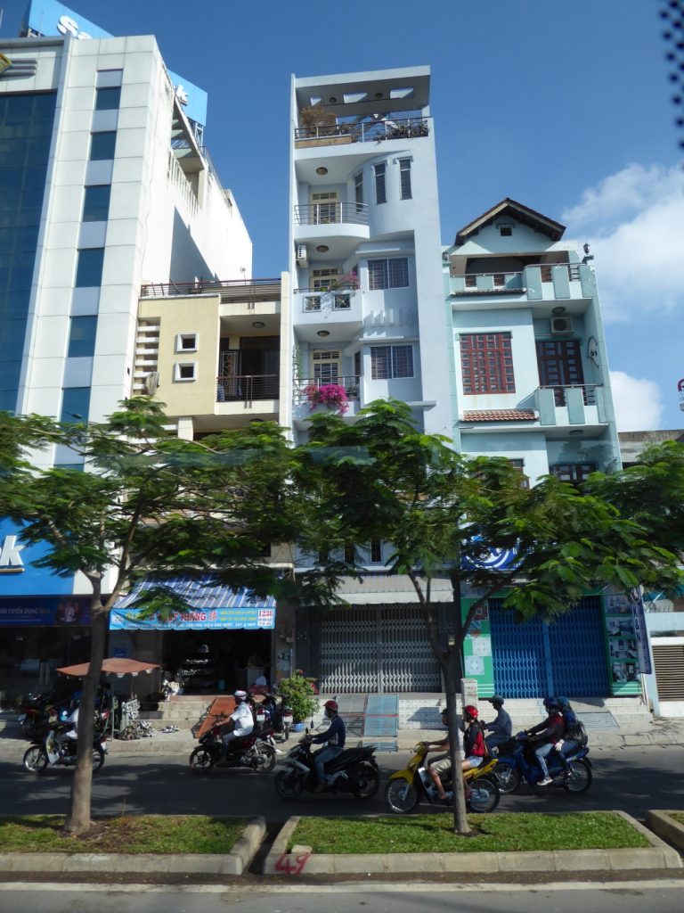 The motorbikes and scooters (called “Hondas” colloquially) are an enduring memory of HCMC in particular. They drive on the pavements as much as on the roads. Crossing roads was a nightmare – Ann hated doing it. Even at pedestrian lights when you get the “Green Man” sign you still have to dodge the Hondas coming at you from all directions, even in a “one-way” street they will be going the wrong way! Once crossing on a Pelican crossing we had to dodge out of the way of a Honda steaming along from one pavement to another.